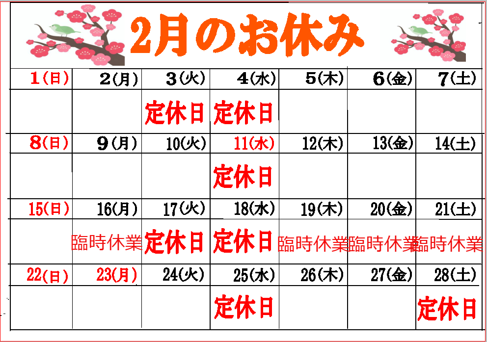 【更新】2026年2月の定休日が更新されました! |